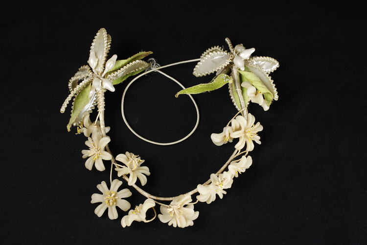 Small round headdress, which would be worn on top of the hair, made from wire bound with cream silky thread and fastened with cream silk hat elastic. The flowers are made of cream wax with yellow stamens. The terminals have canvas leaves painted green and cream plastic leaves and berries. The flower stems are paper-coated wire.