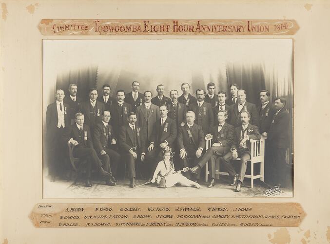 Mounted photograph of the Toowoomba Eight Hour Day Anniversary Union Committee in 1914.