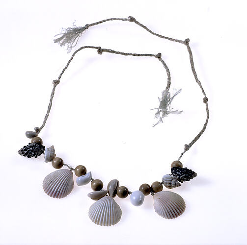 Necklace of plaited and knotted raffia with 12 shells and eight small wooden beads.