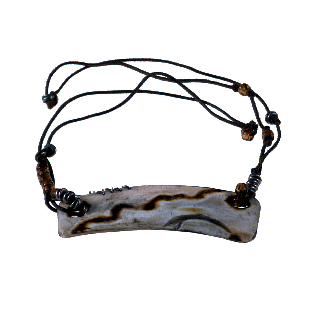 Two necklaces of brown leather thonging with a burnt and carved central animal bone and small plastic and metal beads.