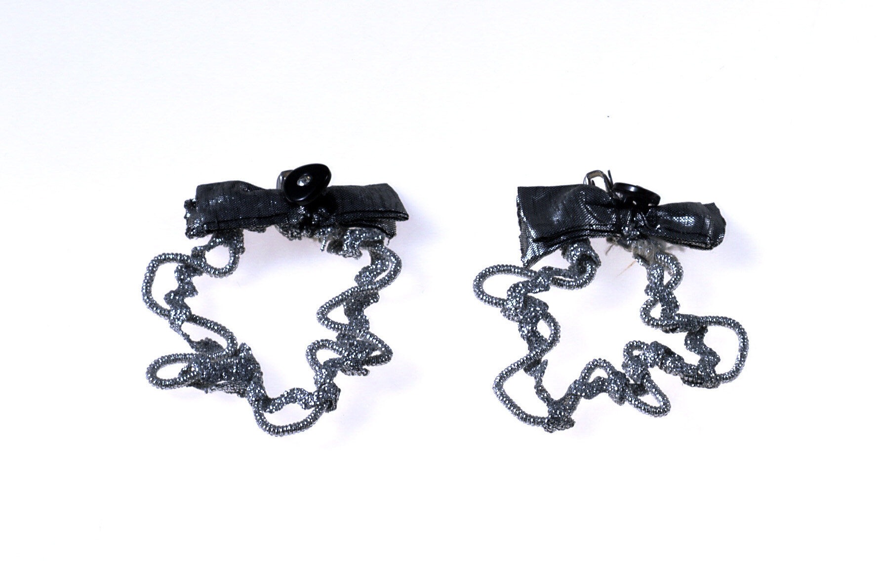 Pair of crunched wire clip-on earrings covered in siver fabric Irregular shaped with silver fabric bar at top decorated with a small black plastic button with central diamante.