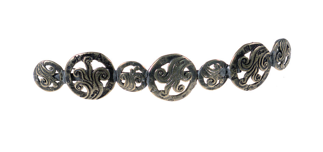 Metal hair clip consisting of a bronze coloured narrow bar with seven medallion- shaped pieces attached. Each medallion has the 'Green the World' symbol of an unfurling fern frond and the jeweller's hallmarks. On the inner side there clip with a safety catch.
