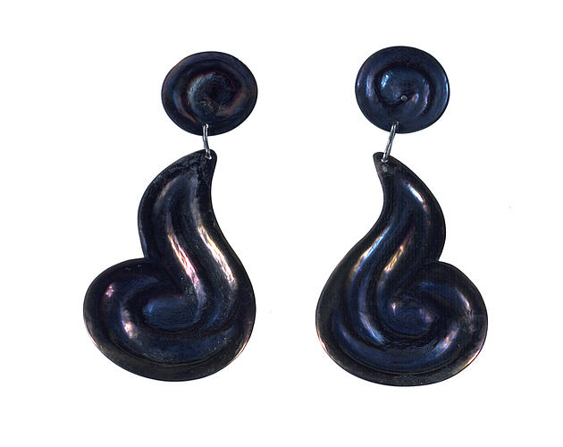 This pair of earrings were commissioned by Prue Acton from the Melbourne jeweller Marcos Davision in 1983. They were originally designed to compliment the donor's 'Titanium' ensemble (SH 942104) at 1983 Melbourne Cup, but were not worn with then. Marcos Davison made many pieces of jewellery for Prue Acton.