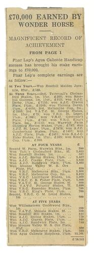 This newspaper cutting, from an unknown newspaper, lists the total career earning for Phar Lap after he won the 1932 Agua Caliente Handicap. It is part of a group collected by the donor's father, Malcolm William Lucas (21/02/1898 - 31/10/1985).
