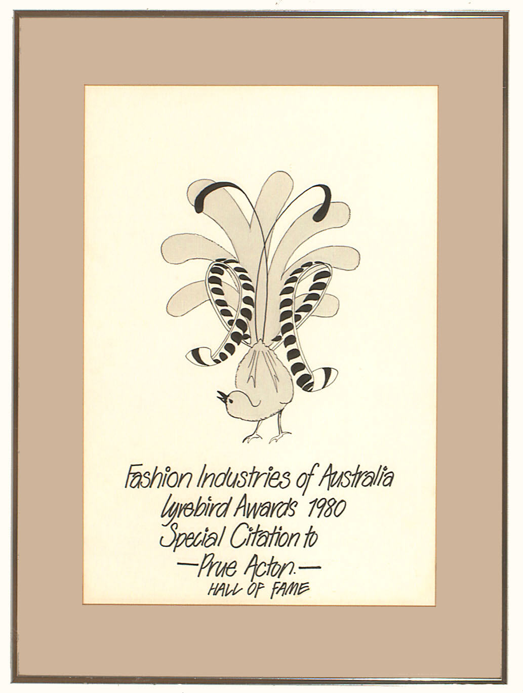 Black text on front of certificate: Fashion Industries of Australia/ Lyrebird Awards 1980/ Special Citation to/ Prue Acton/ HALL OF FAME.