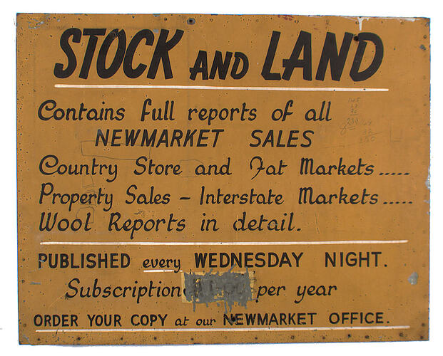 "Stock and Land" newspaper sign, displayed in the Administration Offices at Newmarket Saleyards.