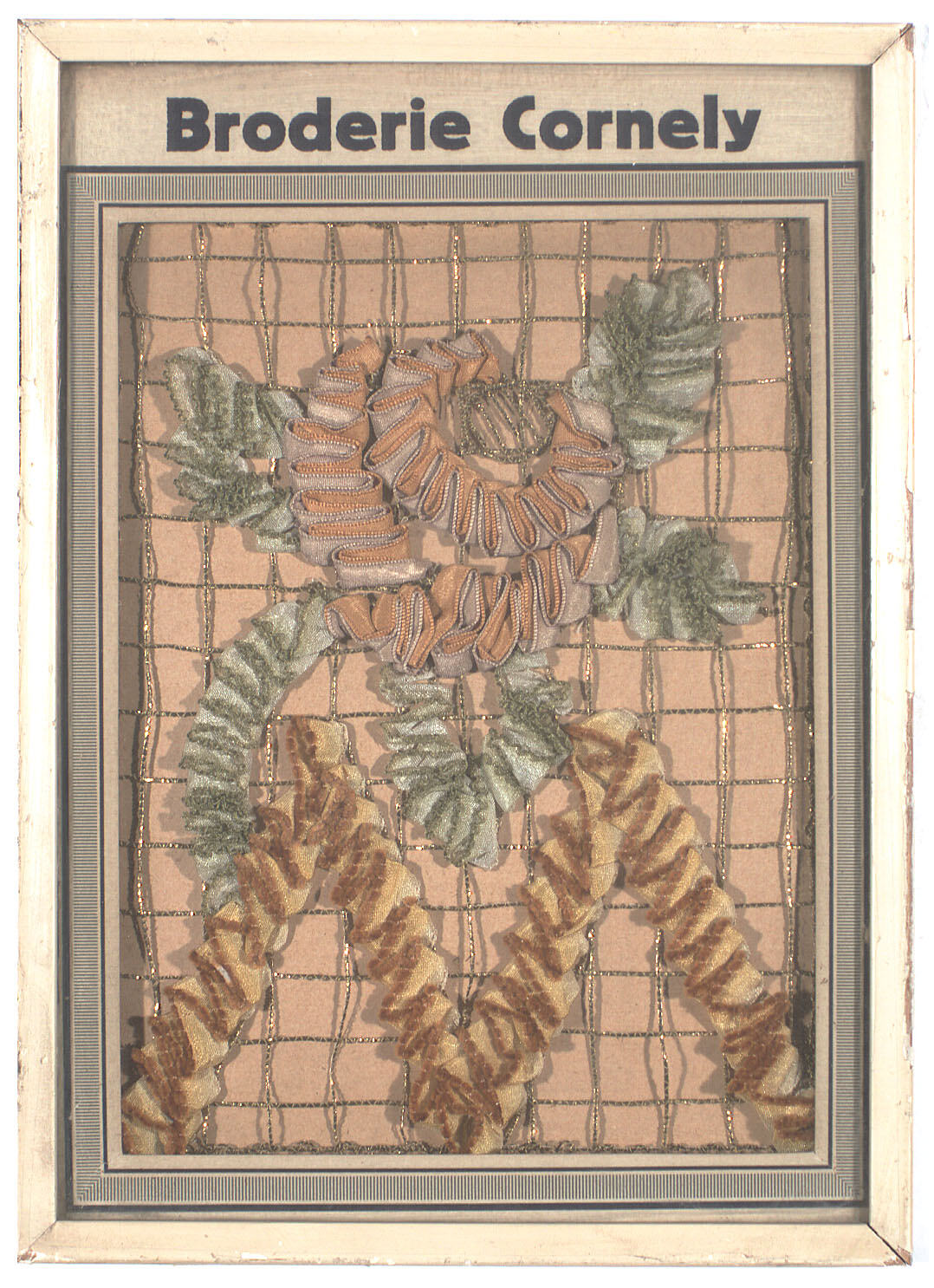 Embroidery sample designed and manufactured in France by Broderie Cornely. The sample was framed and used as decoration at Prue Acton P/L in Melbourne. Broderie Cornely embroidery featured in some of Prue Acton's designs. Ribbon work similar to this decorates a cream jumper in the Museum's collection (SH 942045.)