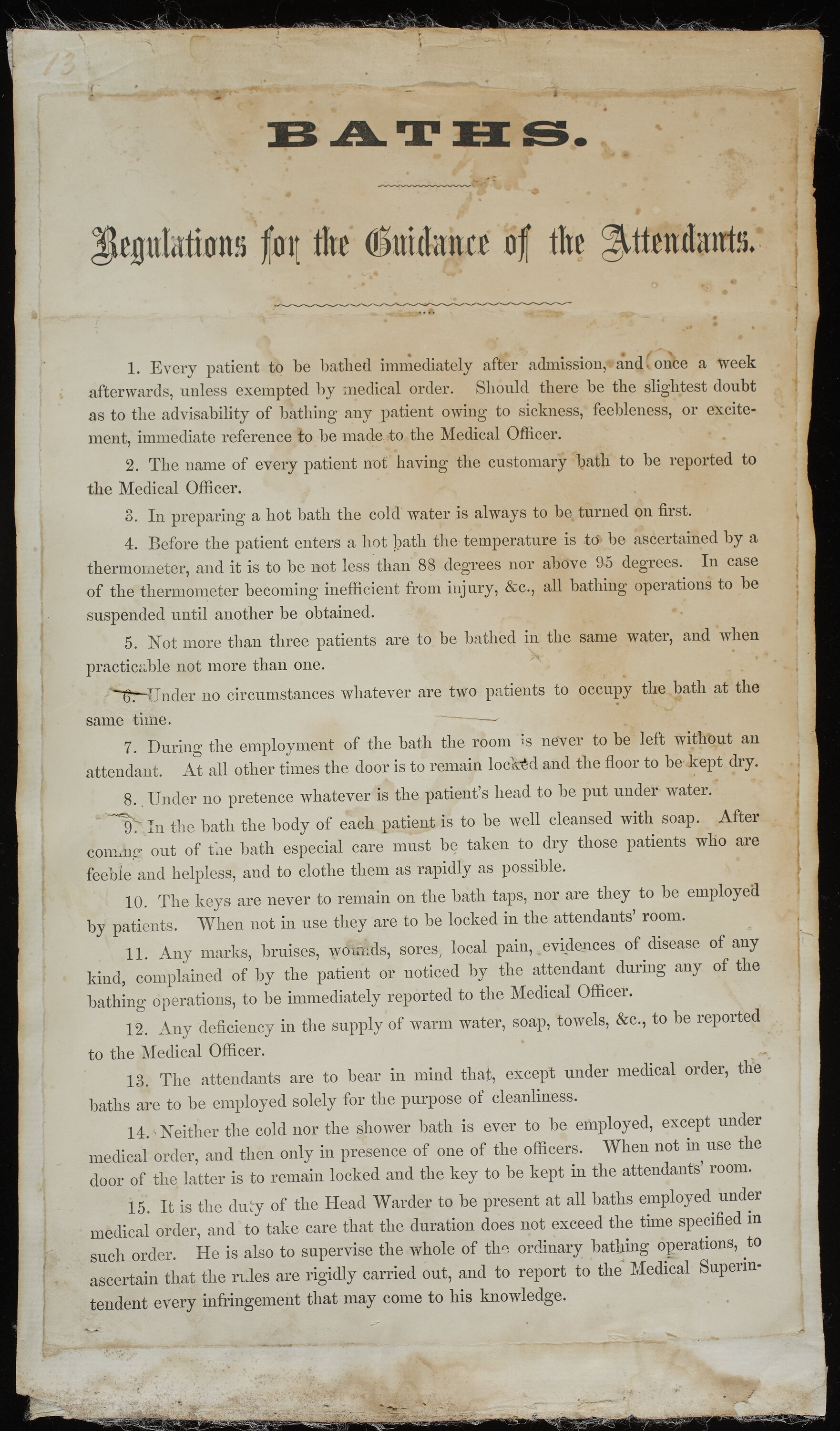 BATHS/Regulations for the Guidance of the Attendants/ Rules No.1 to No.15. Extensive text includes: 'Every patient to be bathed immediately after admission, and once a week afterwards, unless exempted by medical order. ... cold water is always to be turned on first. .. not more thatn three patients are to be bathed in the same water, and when practicable not more than one ... under no circumstances whatever are two patients to occupy the bath at the same time ... during the employment of the bath the room is never to be left without an attendant. At all other times the door is to remain locked and the floor is to be kept dry ... under no pretence whatever is the patient's head to be put under water ... the keys are never to remain on the bath taps, nor are they to be employed by patients ... any marks, bruises, wounds, sores, local pain, evidences of disease of any kind, complained of by the patient or noticed by the attendant ... to be immediately reported to the Medical Officer ... the attendants are to bear in mind that, except under medical order, the baths are to be employed solely for the purpose of cleanliness ... neither the cold nor the shower bath is ever to be employed, except under medical order, and then only in presence of one of the officers ... it is the duty of the Head Warder to be present at all baths under medical order ...