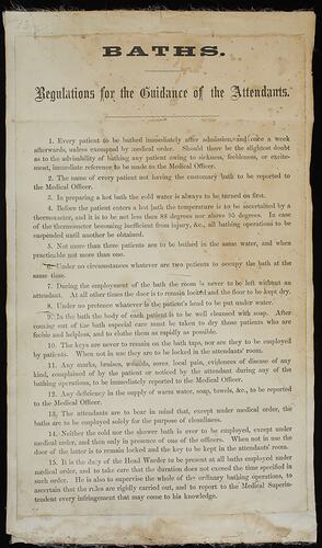 Chart - Bath Regulations, Framed, circa 1920. Printed paper, headed 'Baths. / Regulations for the Guidance of the Attendants', that is contained (though not mounted) within a wooden frame, painted cream, that was made to hang on a wall. Use in a psychiatric hospital in Victoria, Australia probably at a time between 1900 - 1940. Probably hung in the bathroom. There are fifteen regulations for the Attendants to follow when giving the patients their weekly bath. A chart of regulations numbered 1 to 15 for baths for patients in a mental hospital in Victoria. (e.g. Rule no.5: Not more than three patients are to be bathed in the same water, and when practicable not more than one.)