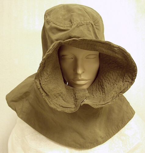 Khaki green hood with round opening for the face. Consists of five panels extending from a round crown piece. The panels extend approximately to the shoulders, flaring outwards. The face opening features a wire-stiffened panel enforced by machine stitching. This panel extends outwards around the entire opening and is buttoned under the chin with a single plastic tan-coloured button.