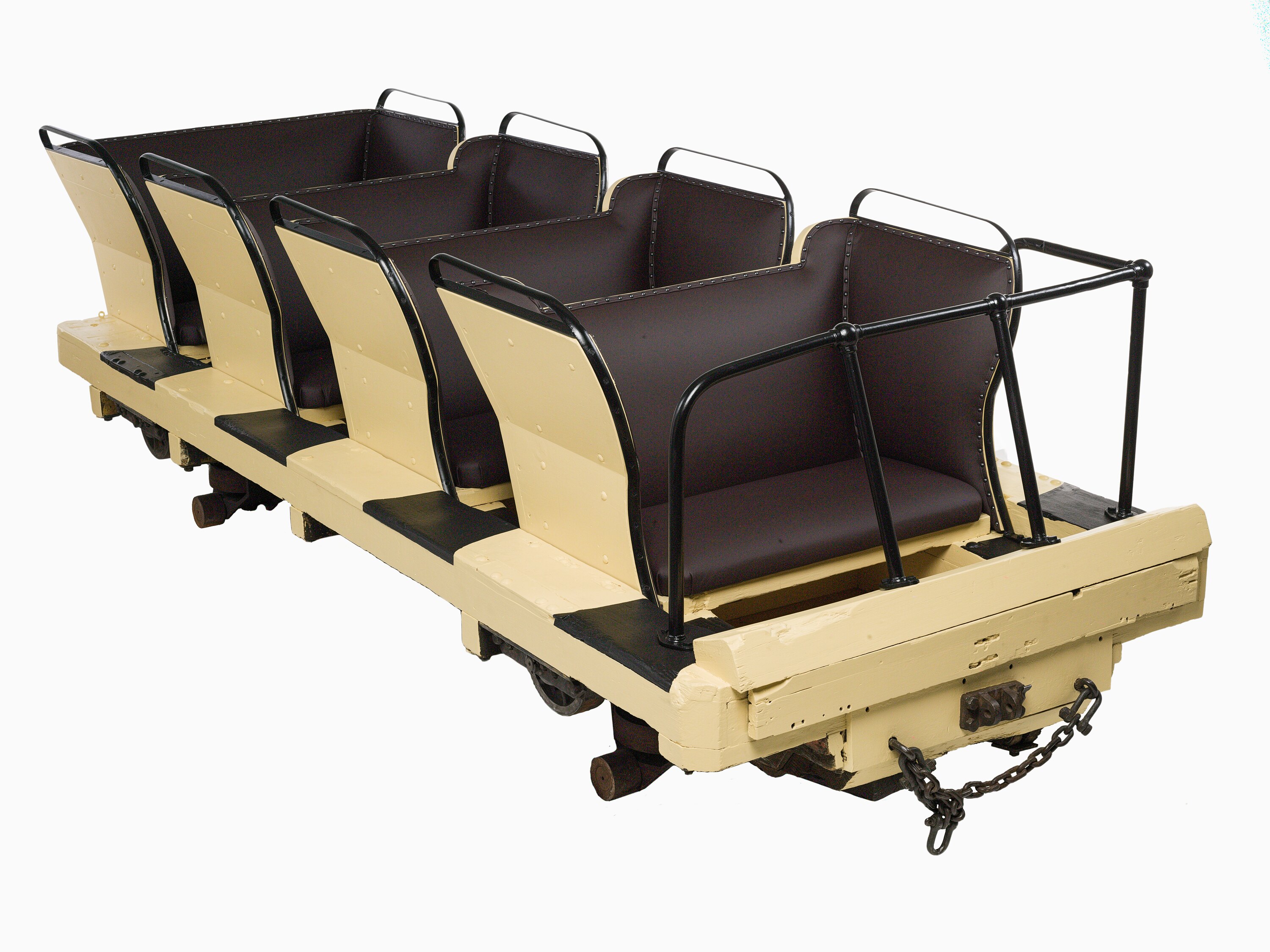 From the ground up, the carriage consists of a metal undercarriage with wheels, a heavy wooden super-structure, and then the four carriage seats. Each of the seats is designed to seat two adults and are upholstered in dark brown leather. There are handrails on the rear of three seats and a number '3' on the back of the rear seat. The seats are surrounded by black painted metal trim. There is a black painted handrail at the front attached to the chassis. The undercarriage has four wheels to go on the widest part of the track and four four sets of inner safety wheels which grip the inner part of the track. At the front of the carriage are two chains; the rear has one chain and a spring-loaded coupling arm.