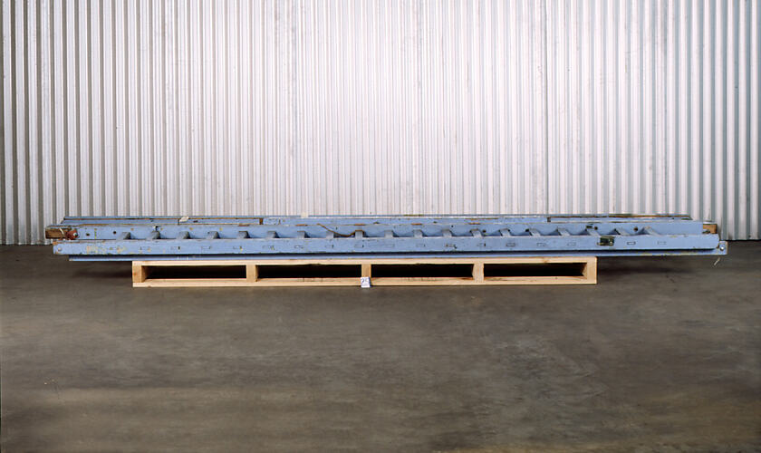Currently disassembled to 8 main blue-painted wooden pieces. When assembled the frame is a tall, rectangular structure. Pieces comprise of: 1. 3.7m tall vertical support painted blue 2. 3,7m tall vertical support painted blue 3. 1.75m long horizontal beam with metal bar studded with pegs 4. 1.75m long horizontal beam with metal bar studded with pegs 5. 3.7m high wooden ladder painted blue (installed at right angle to supports) 6. 3.7m high wooden ladder painted blue (installed at right angle to supports) 7. 1.86m long wooden "hammering bar" with metal plate attached to one side 8. 1.66m long wooden beam with 4 large nails hammered into front side