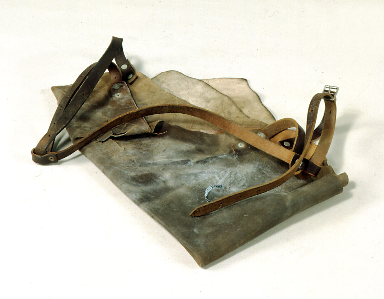 Leather apron was worn by Monty James who was given it by Fred Kilpatrick in the early 1980s. It was worn while working on the rod loom and binding tables at the Royal Victorian Institute for the Blind matmaking workshop, as leaning on the rest board of the loom and on the binding table wore down clothes.