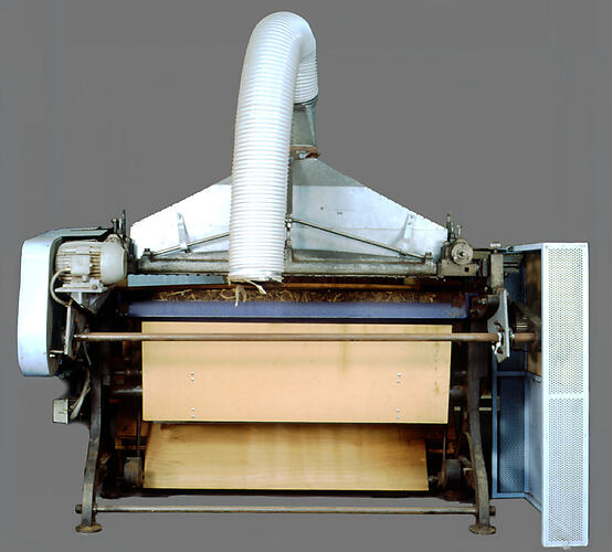 Large piece of machinery with exhaust pipe extending out of triangular metal hood at top. Below hood is rectangular lid which lifts to reveal trimming blades. In front of lid is wooden surface. Behind this, and under the blades, is a spiked roller which draws mats through machine. On left hand side of machine is a blue metal cage around pulley and lever. On right hand side is a blue metal hood which encloses electrics. Below hood is on/off switch. On right side (below hood and in front of switch) is hand turned wheel used before electric conversion. Machine is supported on iron frame on each side. Under wooden surface, at bottom of machine, is a wooden and chipboard ramp where trimmed mats are ejected from machine.