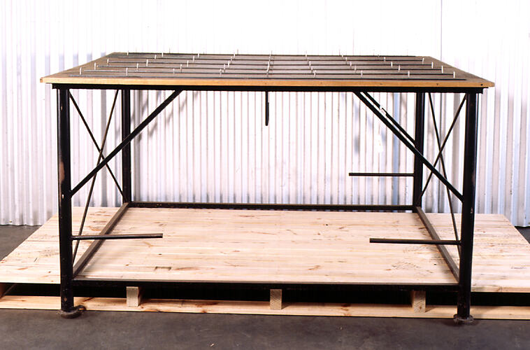 Binding Table manufactured by Melbourne Engineering Company in 1987. It was used at the Royal Victorian Institute for the Blind, circa 1987-1992. This table was used by workers with impaired vision to keep mats from moving while binding the edges. The nails hold the mats in place while the outer edge of the mat is bound by the attachment of a rope plait. This is hand sewn onto the mat using coir fibre, a needle, needle puller, palm and thread holder.