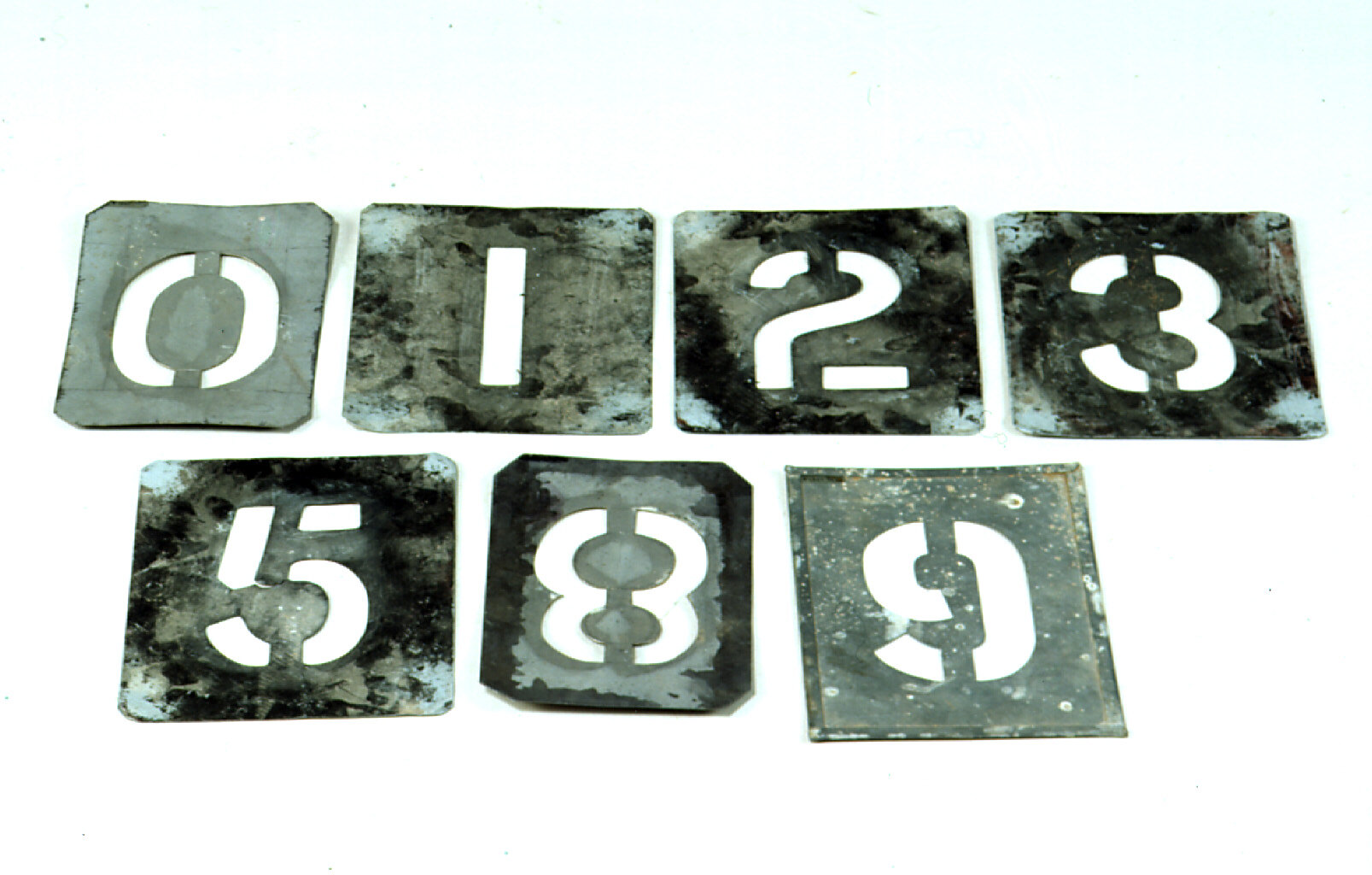 Set of seven metal stencils with the numbers 0, 1, 2, 3, 5, 8, 9 they were used at the matmaking workshop at the Royal Victorian Institute for the Blind, circa 1985-1992. They were used by visually impaired workers in the matmaking workshop to label mats. The numbers indicated the size of the mat.