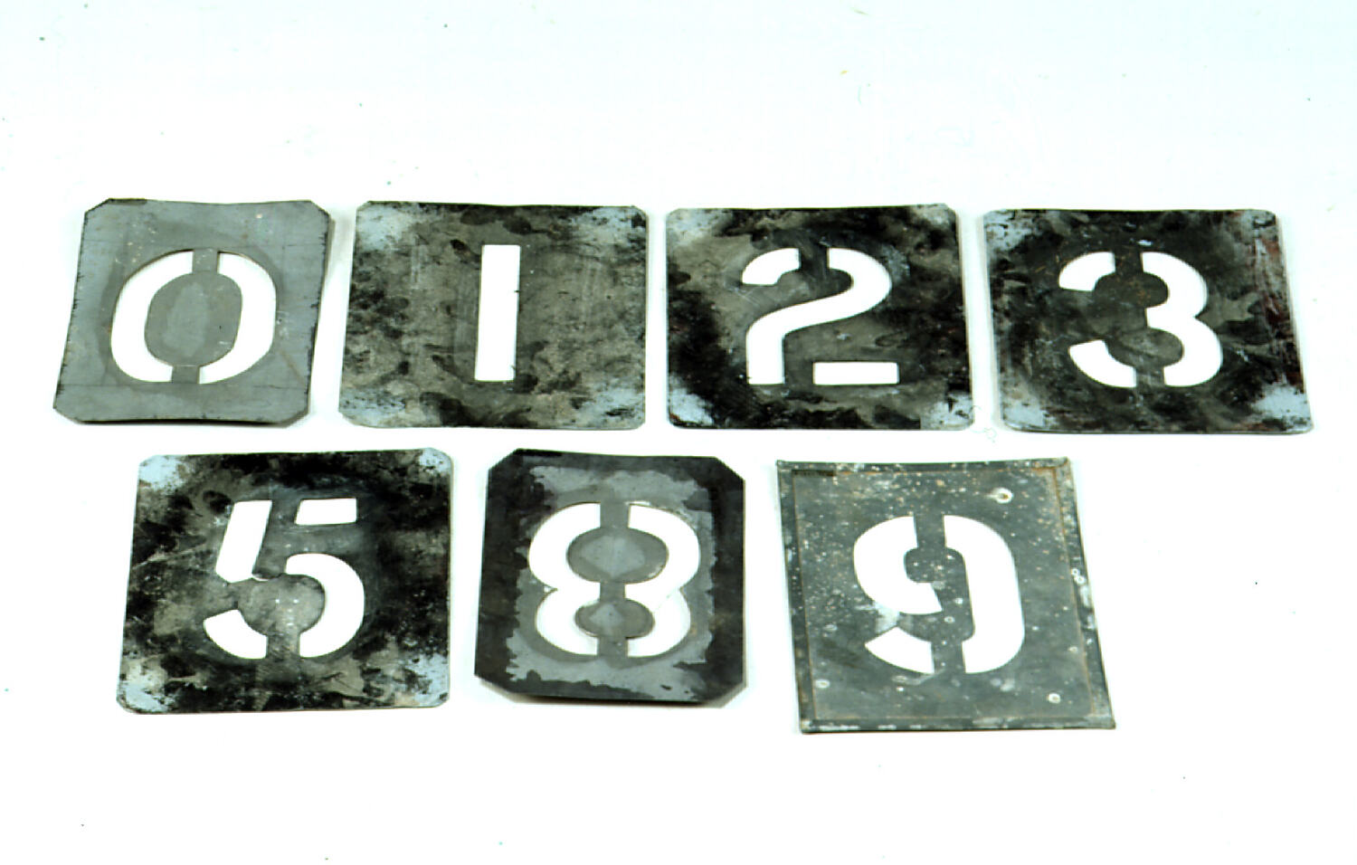 Seven rectangular metal stencils each with a number punched through metal. Numbers are 0, 1, 2, 3, 5, 6 or 9, and 8.