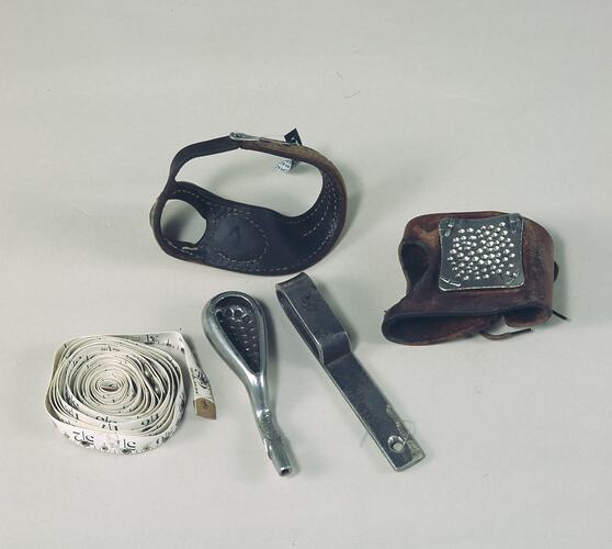Sailmakers Sewing Palm made circa 1985-1986. The palm was used by visually impaired workers in the matmaking workshop at the Royal Victorian for the Blind Institute during the binding of mats to protect their hands. According to factory workers Tom Jennings and Monty James, this palm was brought into the Factory by a Scot, Stuart Allen, who worked in the Factory as a production officer between 1985 and 1986.