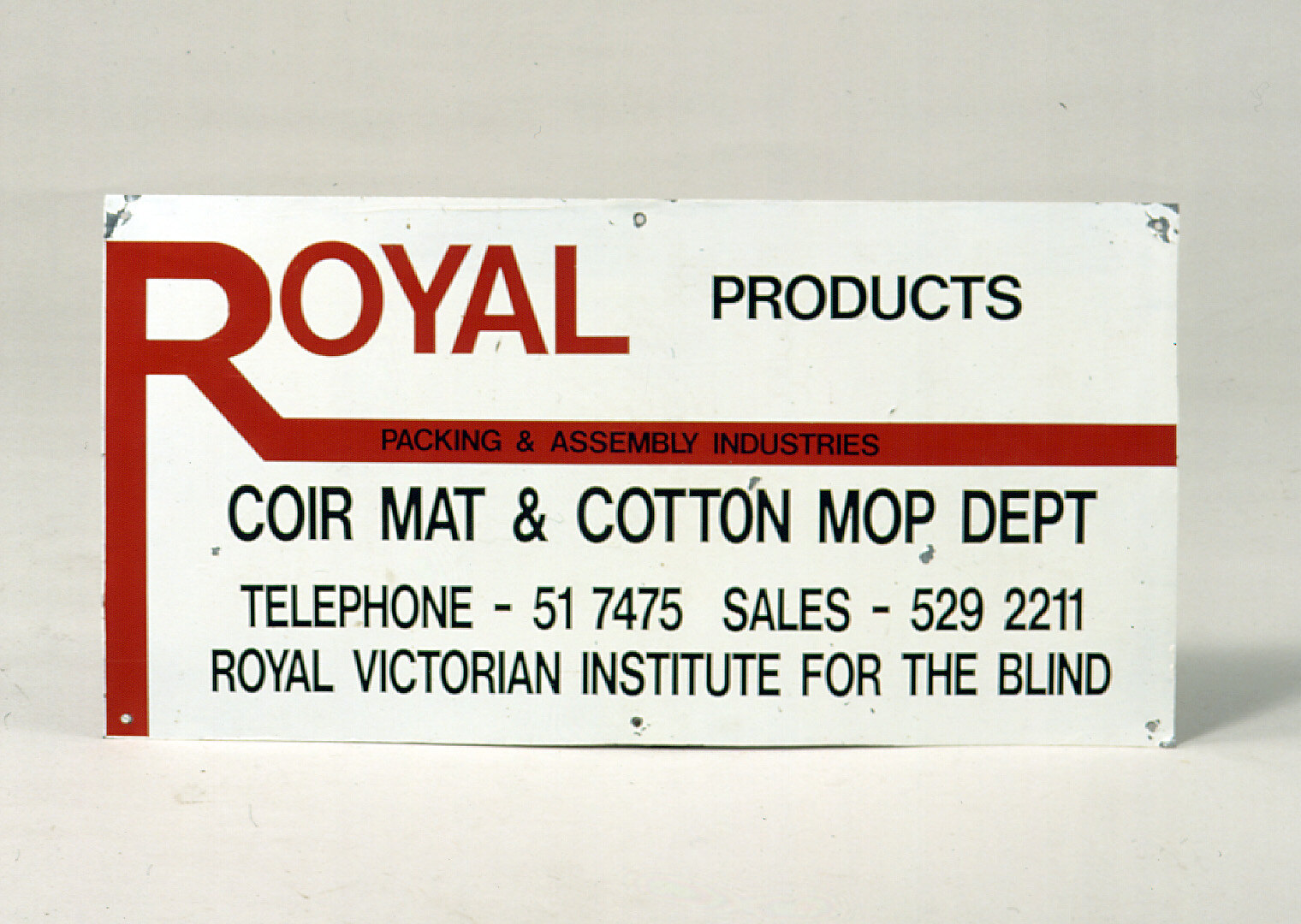 Sign for the Coir Mat & Cotton Mop Department of Royal Products made in 1987. This department was part of the Packing and Assembly Industries of the Royal Victorian Institute for the Blind. The sign was used as the business sign on the door of the workshop at Clifton Street in Prahran. The Factory moved to Prahran in May 1987. When collected the sign was hanging on a wall inside the workshop at the Factory on St. Kilda Road.