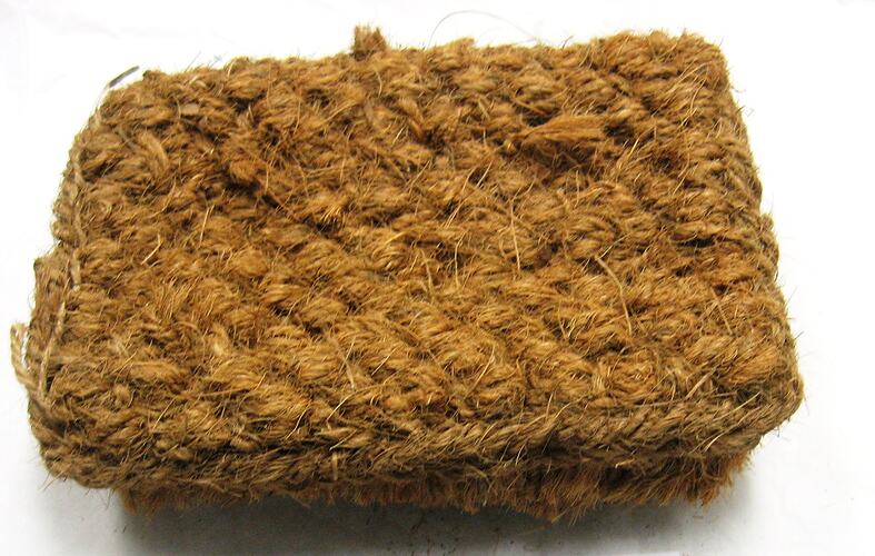 Small rectangular mat manufactured in the matmaking workshops at the R.V.I.B. Factory, circa 1970s-1980s. According to Malcolm Fraser, the workshop supervisor, these small sized mats were sold to a Tasmanian company who fixed to recesses beside the wheels in bitumen laying machines to clean the wheels. This mat was left over after the closure of the workshop in 1992.
