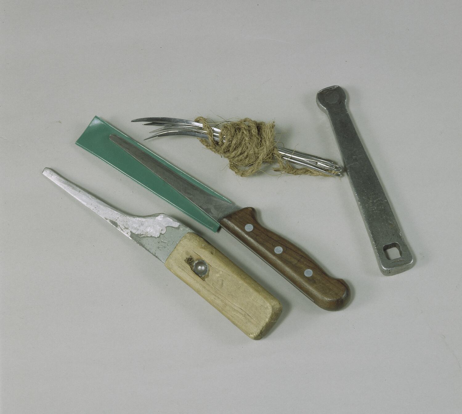 Matmaking knife probably made by former RVIB worker Fred Kilpatrick, circa 1986. The knife was used by visually impaired workers in the matmaking workshop of the Royal Victorian Institute for the Blind on the rod loom. Coir was wound around a rod which was then passed between the weft strings on the loom. The knife was then used to cut along the hollow edge of the rod, thus forming the mat pile. It is believed this knife was made by factory worker Fred Kilpatrick specifically for this task from a piece of old hacksaw blade.