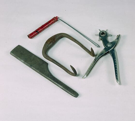 Peg puller made by R.V.I.B. Factory workers, possibly by Fred Kilpatrick, circa 1985. The plug puller was used by visually impaired workers to repair mats in the matmaking workshop at the Royal Victorian Institute for the Blind. A short `plug' of coir was folded in half then wrapped around puller pulled through the hole in the mat.
