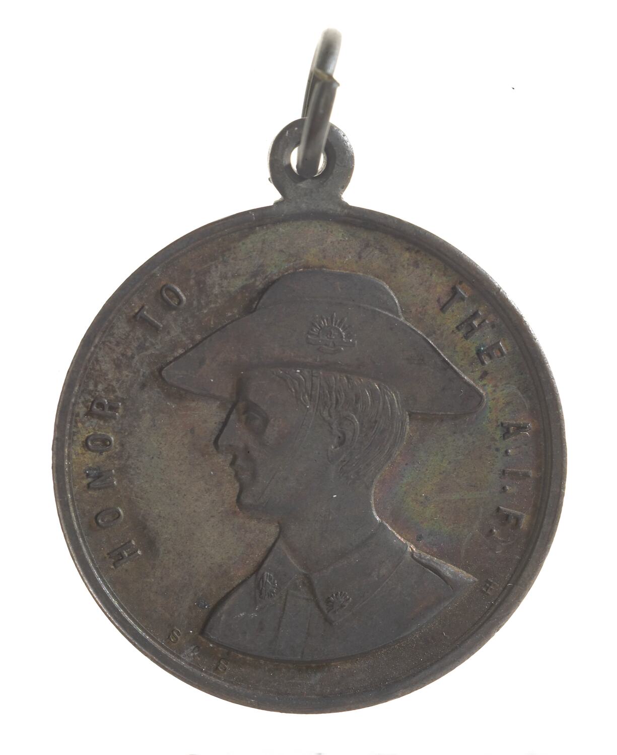 Bust of uniformed soldier wearing hat facing left; around, HONOR TO THE A.I.F. below in small letters the mint initials, S&S