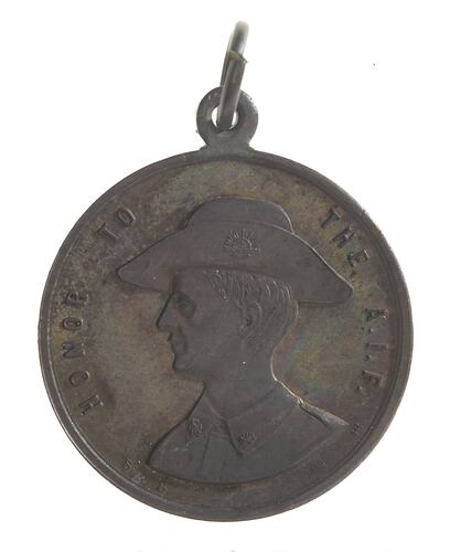 plain (edge) Bust of uniformed soldier wearing hat left; around, HONOR TO THE A.I.F. (obverse) On scroll which rests on olive branch, GALLIPOLI / FRANCE / PALESTINE; above EVD ; below, ANZAC DAY 1918 (reverse)
