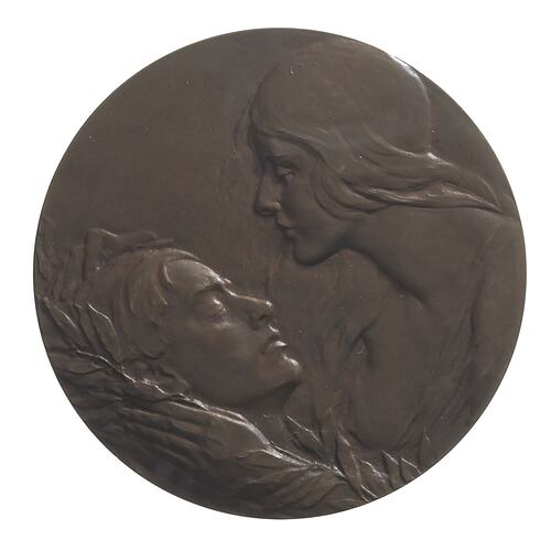 The medal was produced and sold to raise funds for of Australians and New Zealanders maimed in World War I. Dora Ohlfsen was one of Australia's foremost medallists in the first half of the twentieth century, although she principally lived in Europe and was better appreciated outside Australia. This medal is one of the most remarkable of all Australian commemorative medals. Its sensitive, romantic treatment of its subjects recalls European, and particularly French, medallic art. It was made at the artist's expense. She had worked as a nurse for the Red Cross in Italy during World War I, and was deeply moved by the experience.