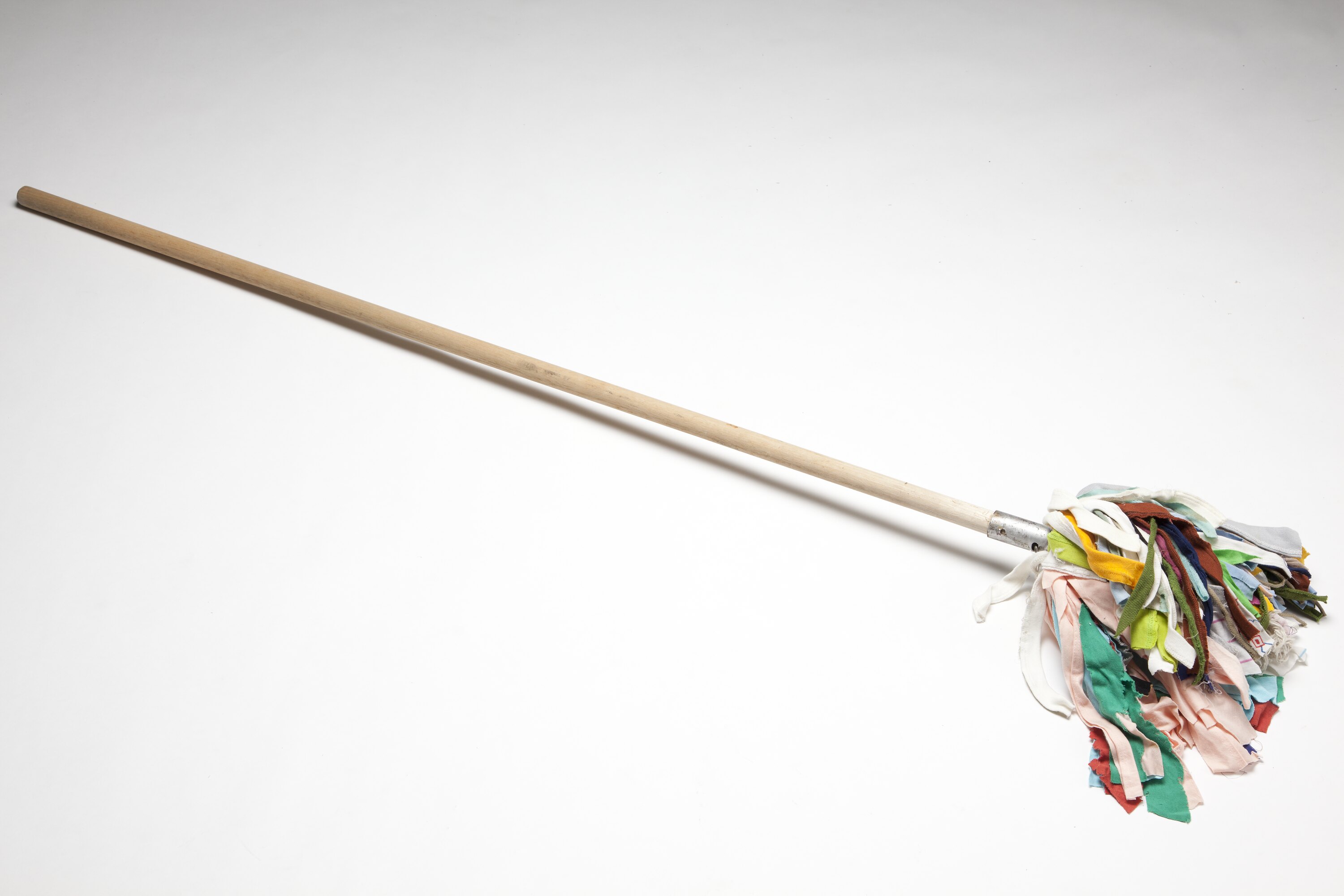 Mop with long wooden handle. The head is made up of strips of fabric in a variety of colours including: grey, red, white, dark blue, light blue, sky blue, red and white stripped, yellow, lemon, hot pink, magenta, green, flesh and black, it is attached to the handle with a metal holder.