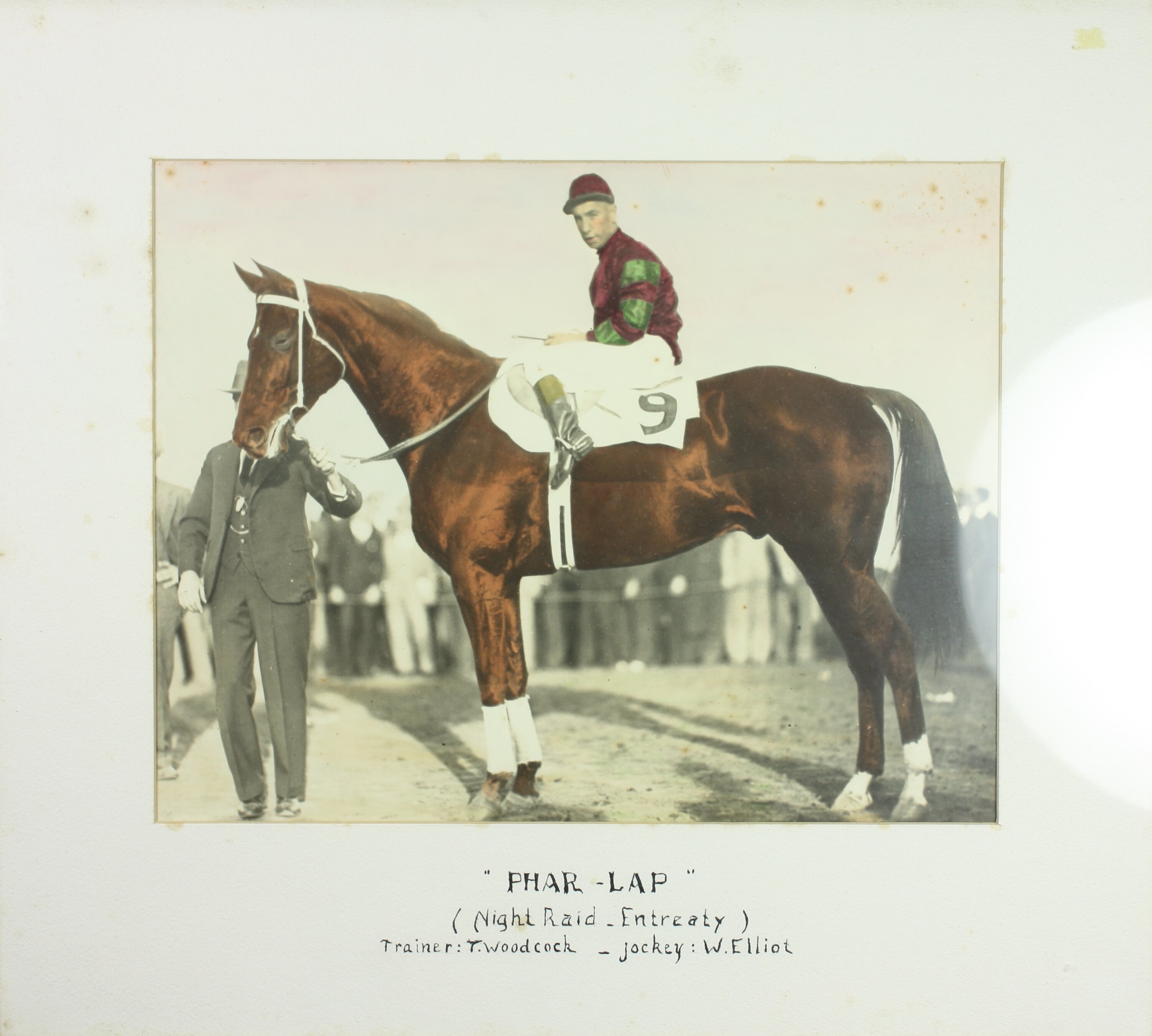 Handwritten in black ink on mount underneath photograph: "PHAR LAP"/ (Night Raid - Entreaty)/ Trainer: T.Woodcok - Jockey: W.Elliot