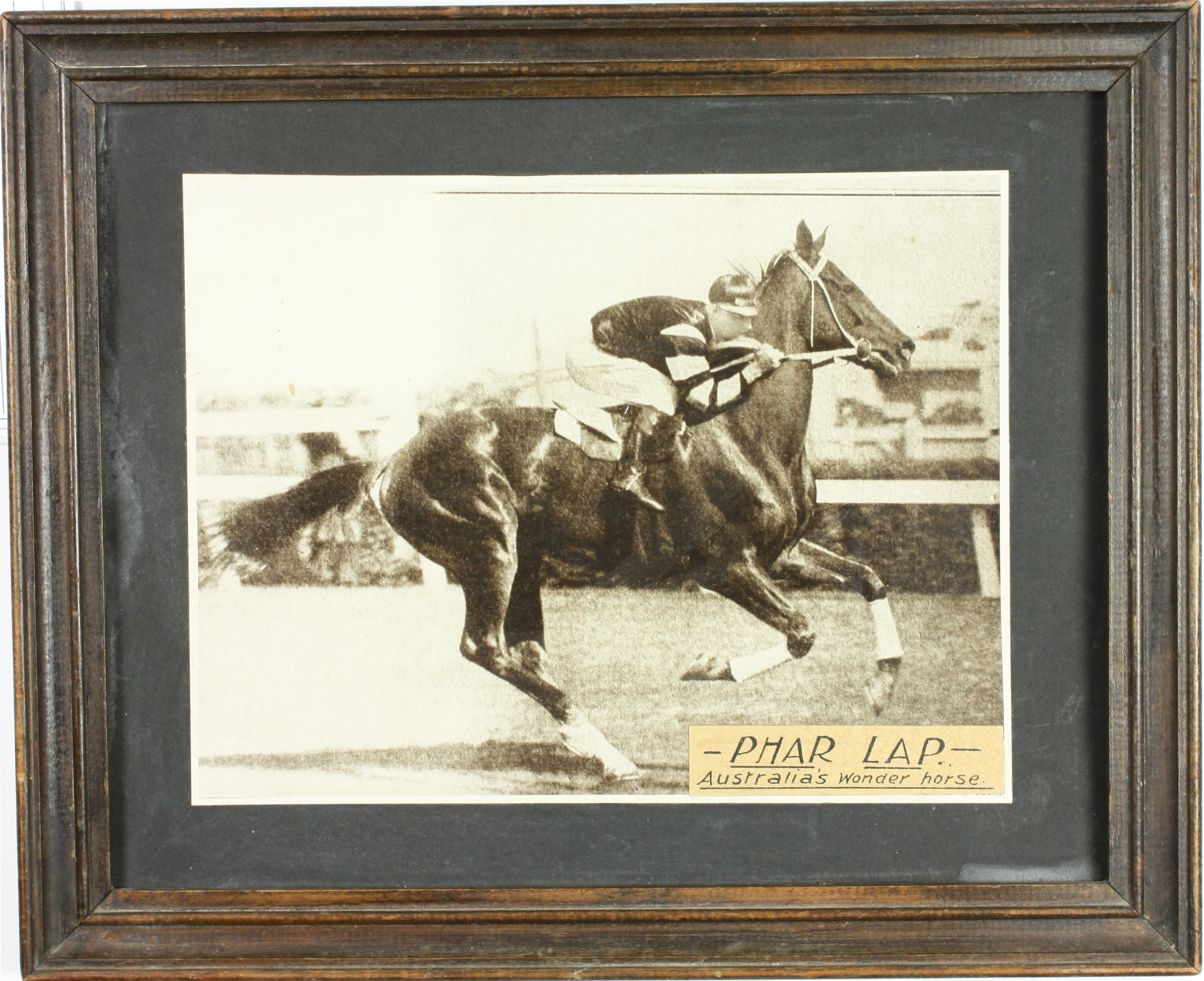 Handwritten in black ink on small card glued to photograph: PHAR LAP/ Australia's wonder horse