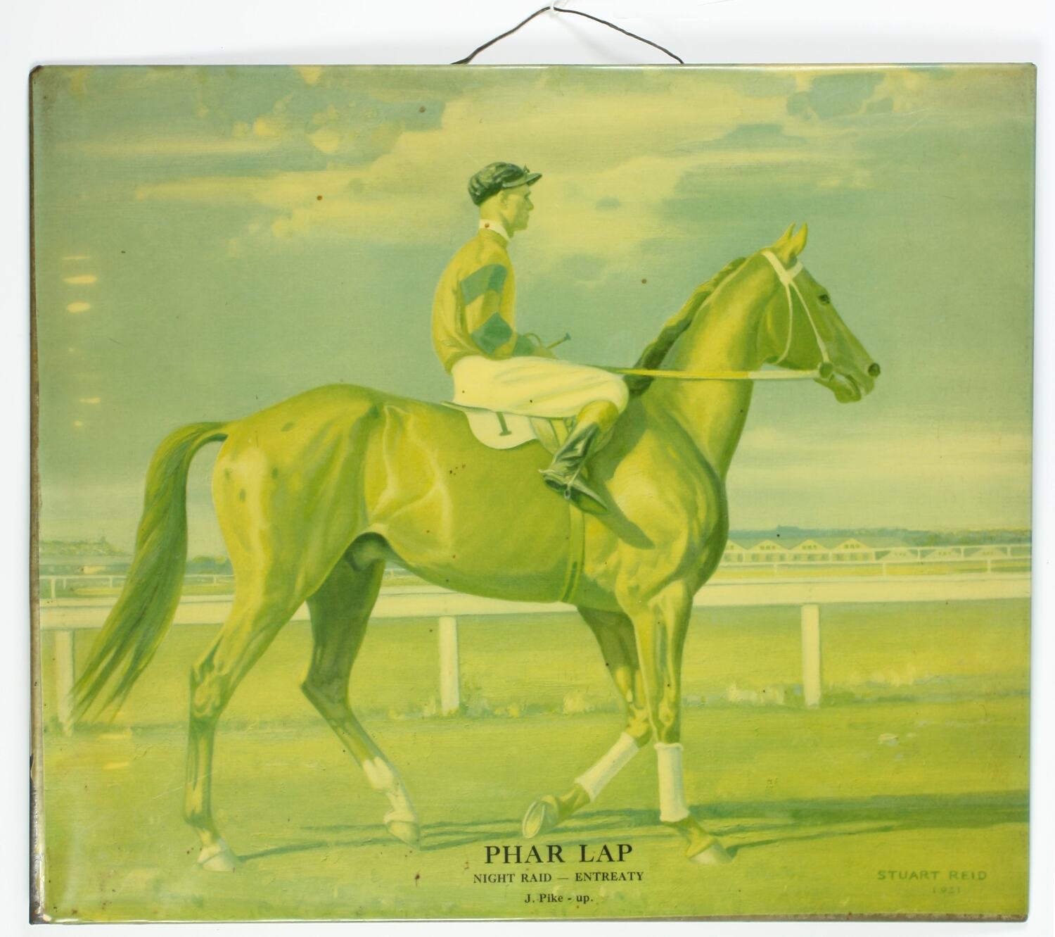 This mounted picture is a reproduction for mass circulation of Stuart Reid's 1931 portrait of Phar Lap, and is an example of the souvenirs which were produced and sold during Phar Lap's life. Jim Pike is wearing the red and green racing colours of the Telford/Davis partnership, which Phar Lap raced under during 1931 and 1932.
