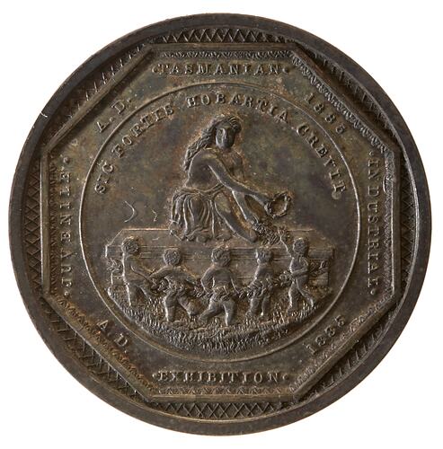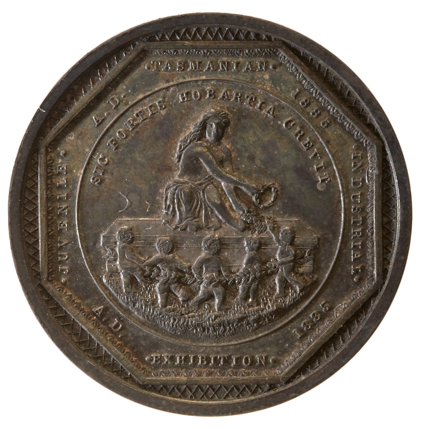 Around inside of octagonal border linked to the medal rim by checker-work, A.D. 1883 . TASMANIAN . . JUVENILE . . INDUSTRIAL . . EXHIBITION . A.D. 1883 , at centre within a line circle, Hobart crouching on an altar, before which five children dance, presenting a victor's wreath the the first child; around above SIC FORTIS HOBARTIA CREVIT