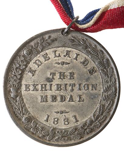 Within a broad rim decorated with British and Australian flowers; ADELAIDE / THE / EXHIBITION / MEDAL / 1881
