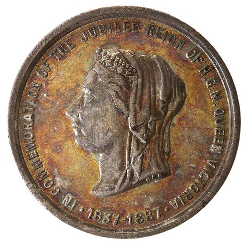 At centre, a profile portrair of Queen Victoria crowned and veiled facing left; around, IN COMMEMORATION OF THE JUBILEE REIGN OF H.G.M. QUEEN VICTORIA . 1837 - 1887 .