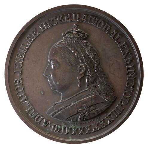 At centre, profile portrait head of Queen Victoria crowned and wearing a long veil facing left; around, ADELAIDE JUBILEE INTERNATIONAL EXHIBITION . MDCCCLXXXVII E.A. ALTMANN . MELBOURNE in tiny letters under bust