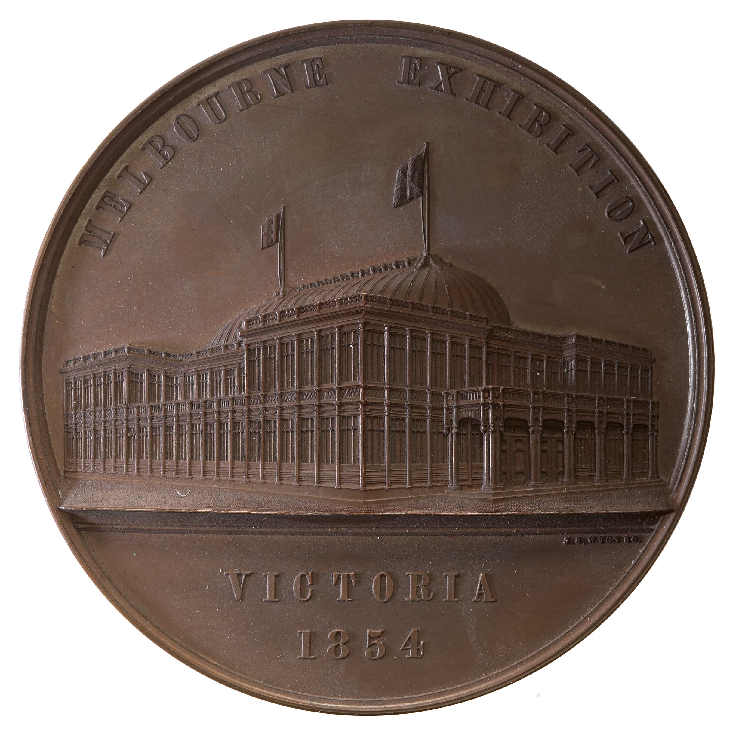 Edge: Impressed; PRIZE MEDAL * 373 * H. LAING (BENDIGO) * MANUFACTURED METALS * Obverse: MELBOURNE EXHIBITION above the Exhibition building, in exergue: VICTORIA / 1854 J.S.WYON SC. Reverse: no inscription