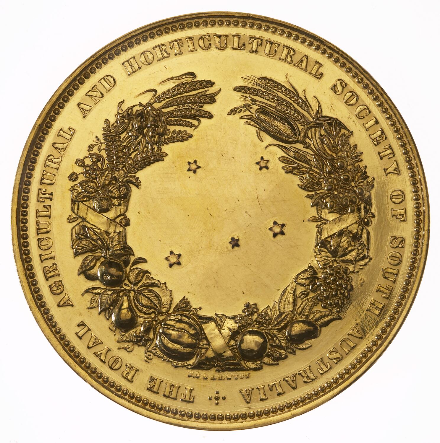 THE ROYAL AGRICULTURAL AND HORTICULTURAL SOCIETY OF SOUTH AUSTRALIA around a wreath of fruit, vegetables and grain surrounding the Southern Cross. At base of wreath in small letters, J.S. & A.B. WYON