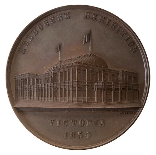 Other Details: A bronze prize medal (64 mm diameter) awarded to Mrs. Watson by the Melbourne 1854 Exhibition. It features a view by J.S. Wyon, whose name appears at the top right of the exergue, of the specially built exhibition building as it would have been seen from the Flagstaff Gardens. The medal was awarded for a display of Seaweeds. The Exhibition opened on 17 December 1854 and ran for 30 days. Around 40,000 people attended - half of Melbourne's population. The exhibition building, at the site of the later Royal Mint in William Street, was based on the design of the Crystal Palace in London, which had hosted the Great Exhibition only three years earlier, in 1851. Melbourne's exhibition building had 200 ornamental windows and was lit by 306 gaslights. The exhibition included a modest 428 exhibits, mainly local industrial and agricultural products. Some of these exhibits went to Paris for the 1855 Exhibition.