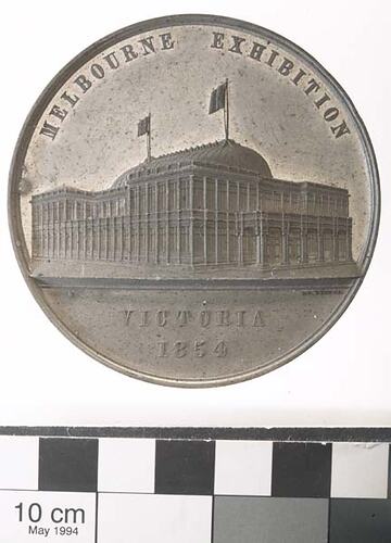 Other Details: A uniface white metal trial for the prize medal (64 mm diameter) awarded at the Melbourne 1854 Exhibition. It features a view by J.S. Wyon, whose name appears at the top right of the exergue, of the specially built exhibition building as it would have been seen from the Flagstaff Gardens. The Exhibition opened on 17 December 1854 and ran for 30 days. Around 40,000 people attended - half of Melbourne's population. The exhibition building, at the site of the later Royal Mint in William Street, was based on the design of the Crystal Palace in London, which had hosted the Great Exhibition only three years earlier, in 1851. Melbourne's exhibition building had 200 ornamental windows and was lit by 306 gaslights. The exhibition included a modest 428 exhibits, mainly local industrial and agricultural products. Some of these exhibits went to Paris for the 1855 Exhibition.