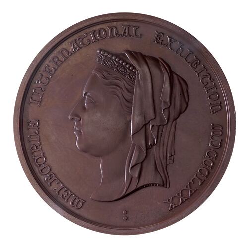 Head of Queen Victoria, wearing small crown and veil left; around, MELBOURNE INTERNATIONAL EXHIBITION MDCCCLXXX .