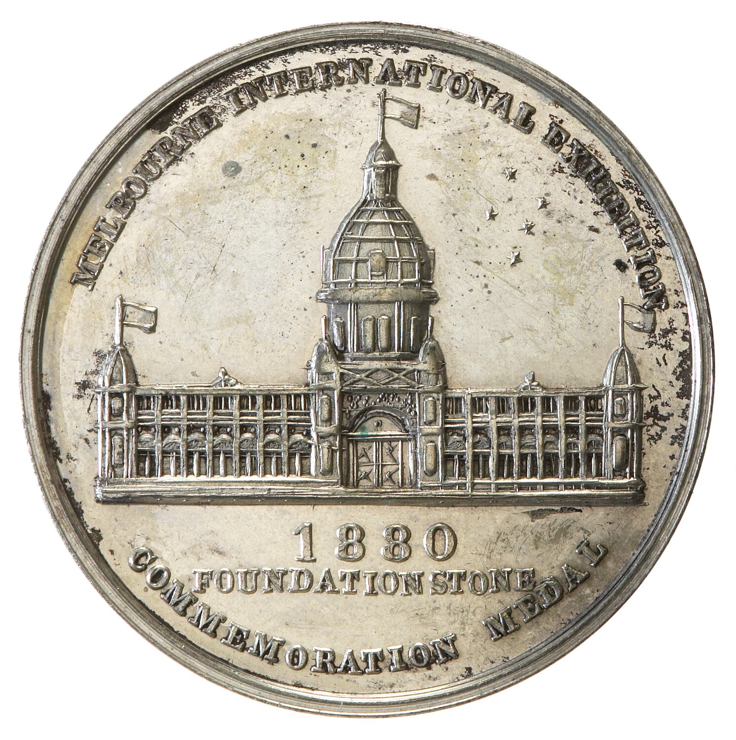 At centre a view of the proposed Exhibition Building with Southern Cross in the sky above right; around above, MELBOURNE INTERNATIONAL EXHIBITION ; in exergue, 1880 / FOUNDATION STONE / COMMEMORATION MEDAL