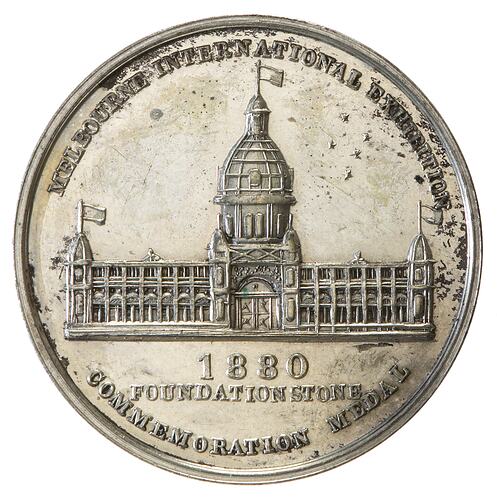 Other Details: This is a silver strike of the medal issued to commemorate the laying of the Foundation Stone for the Melbourne Exhibition Building. Gold medals were distributed in February 1879, manufactured by the Melbourne Mint. The Mint also prepared two silver and bronze pieces for its own collection. This medal was displayed at the 1880 Exhibition as part of the Mint exhibit.