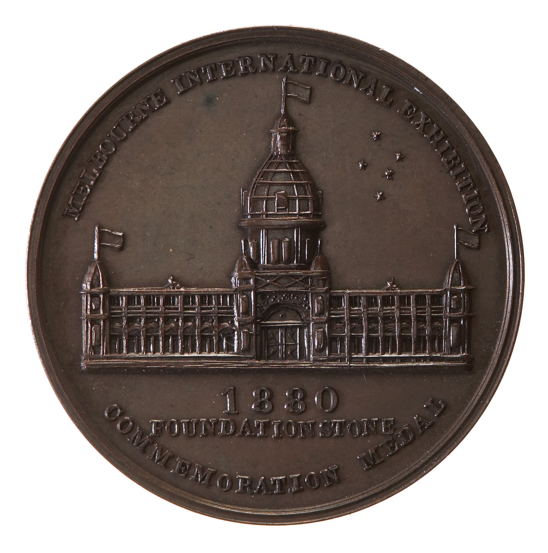At centre a view of the proposed Exhibition Building with Southern Cross in the sky above right; around above, MELBOURNE INTERNATIONAL EXHIBITION ; in exergue, 1880 / FOUNDATION STONE / COMMEMORATION MEDAL