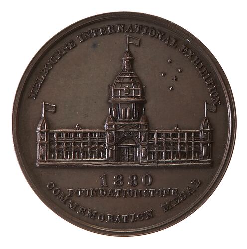 Other Details: This is a bronze strike of the medal issued to commemorate the laying of the Foundation Stone for the Melbourne Exhibition Building. Gold medals were distributed in February 1879, manufactured by the Melbourne Mint. The Mint also prepared two silver and ond bronze pieces for its own collection. This medal was displayed at the 1880 Exhibition as part of the Mint exhibit.