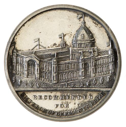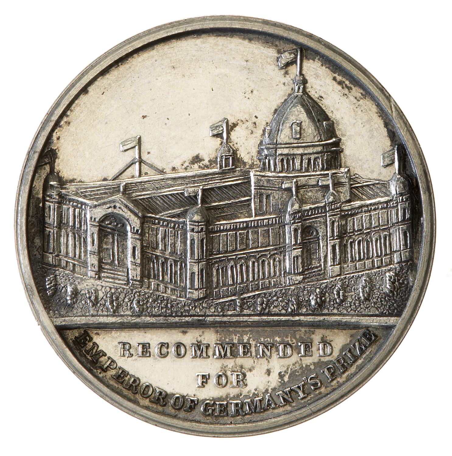 A silver medal from the dies used to strike gold prizes issued to finalists in the Emperor of Germany's Prize. It features a view of the complete 1880 Exhibition Buildings as seen from above from the north west corner.