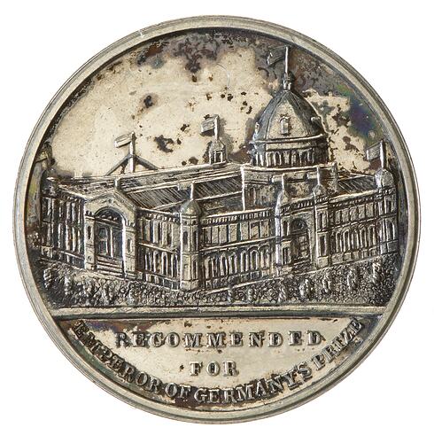 A silver medal from the dies used to strike gold prizes issued to finalists in the Emperor of Germany's Prize. It features a view of the complete 1880 Exhibition Buildings as seen from above from the north west corner.