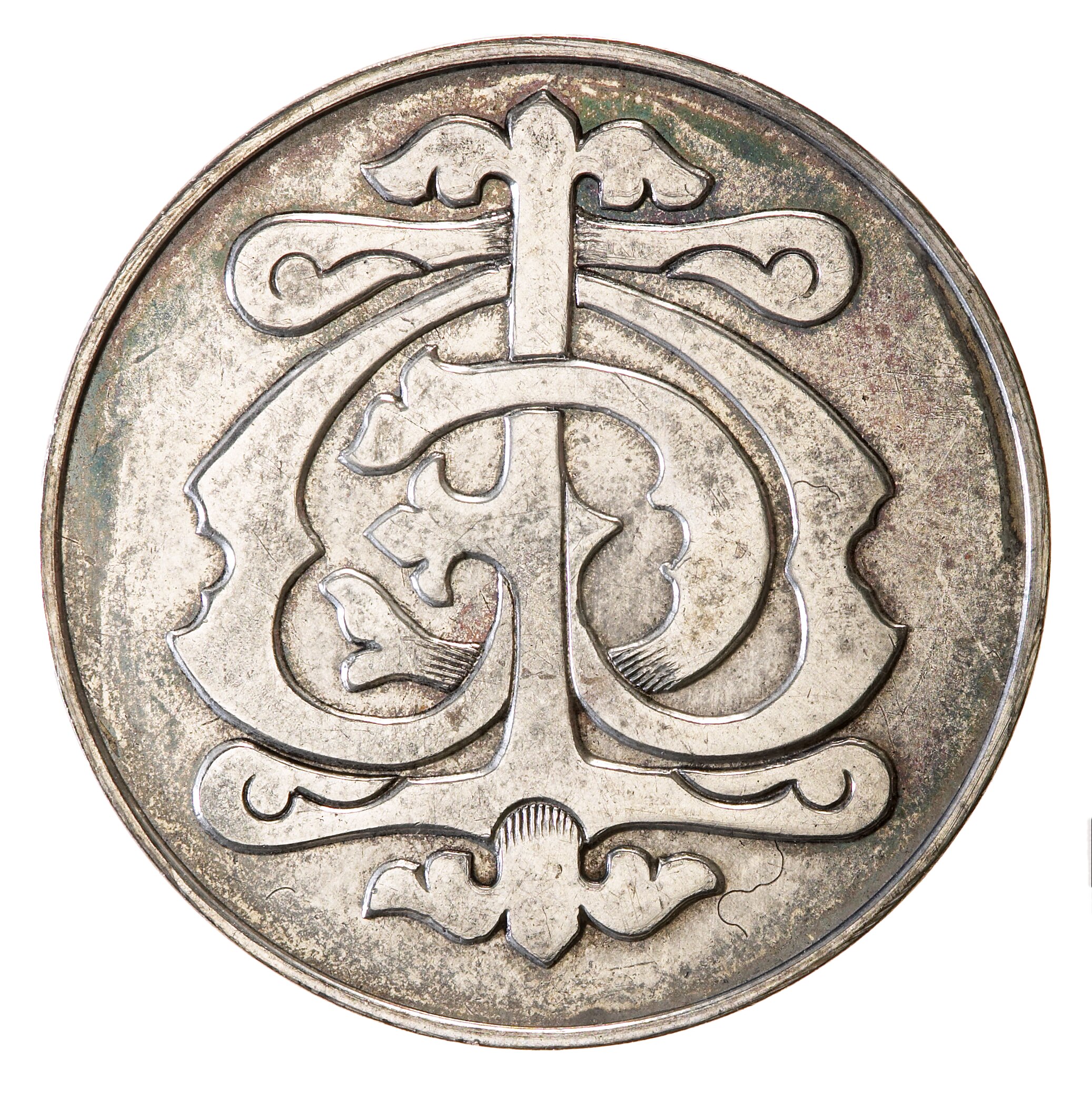 A silver medal featuring a monogram of the letters 'MEC' and an olive wreath joined at the base by a small harp.