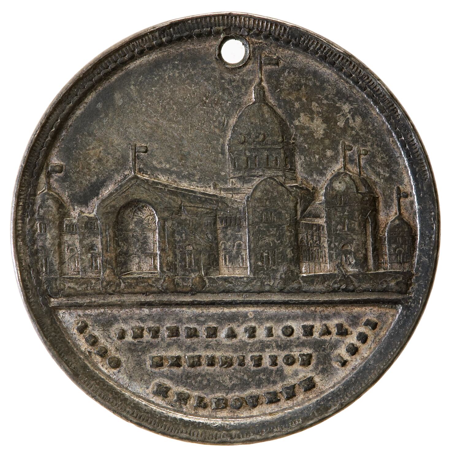 Other Details: This medal was struck for sale to visitors to the exhibition. It features view of the Exhibition Building from the south-east and a shield below a rising sun and surrounded by the flags of Austria, Prussia, France, United Kingdom, United States of America and Belgium. It is not holed and was probably originally worn with a coloured ribbon. The Melbourne International Exhibition ran from 1 October 1880 to 30 April 1881. The exhibition building that still stands was constructed for the occasion, designed by Joseph Reed and built by David Mitchell. Over 1.3 million people visited the exhibition at a time when Melbourne's population was only around 282,000.